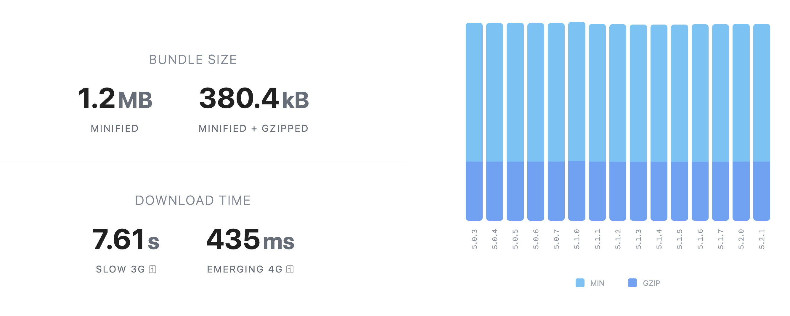 antd 라이브러리를 검색해보았더니 위처럼 번들 크기와 다운로드하는 데 걸리는 시간을 알 수 있었습니다. 이 중 minified와 gzipped가 무엇인지 궁금했는데 minified는 띄어쓰기나 주석 같은 코드에서 불필요한 요소들을 제거한 뒤의 크기이고, gzipped는 gzip 압축을 통해 줄어든 사이즈를 말한다고 합니다. gzipped된 사이즈가 실제로 네트워크에 전송되는 사이즈를 반영하므로 이 부분이 페이지의 성능에 영향을 미친다고 합니다.