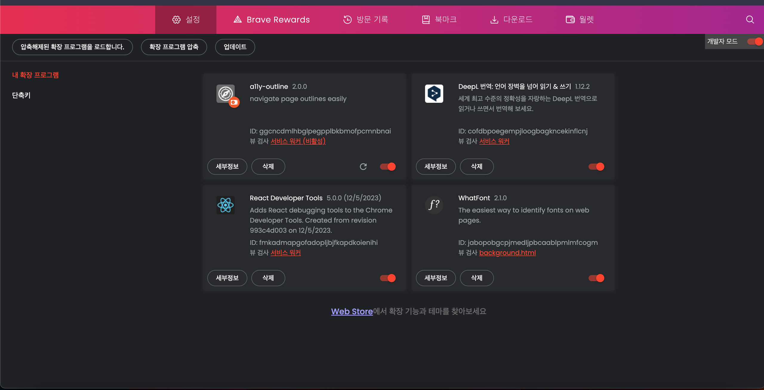 - 이때 "Developer mode" 가 체크되어있도록 하세요. (오른쪽 위)